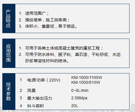 KM-1500是使用國外先進的螺旋泵送技術(shù),并結(jié)合國內(nèi)實際施工需求而開發(fā)出的一種新型灌漿與噴涂兩用機械。
