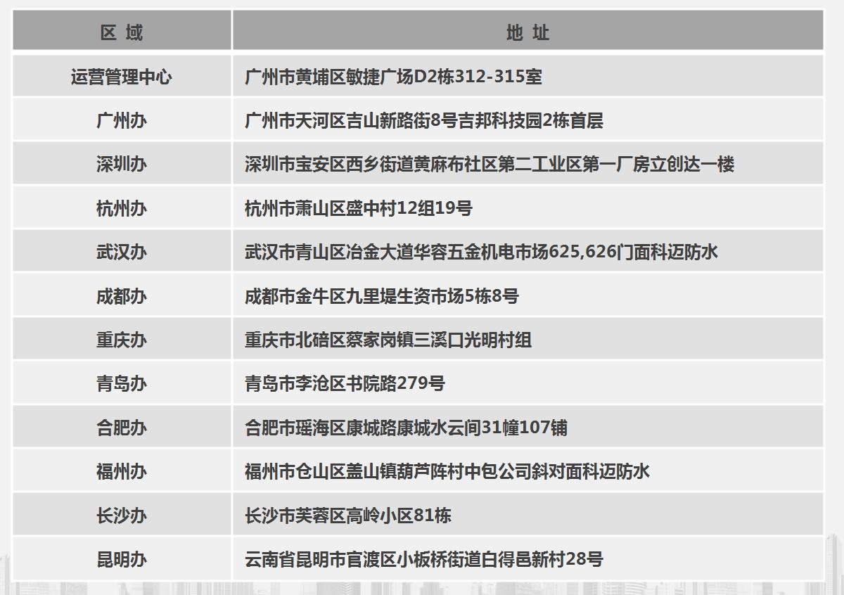 運營中心地址:廣州市黃埔區(qū)水西路193號蘿崗敏捷廣場D2棟312-315室